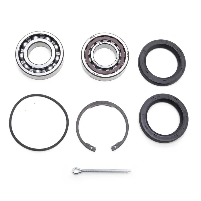 Kit includes: 2x bearings, 2x oil seals, 1x O-ring, 1x circlip and 1x split pin. For IRS rear suspension.